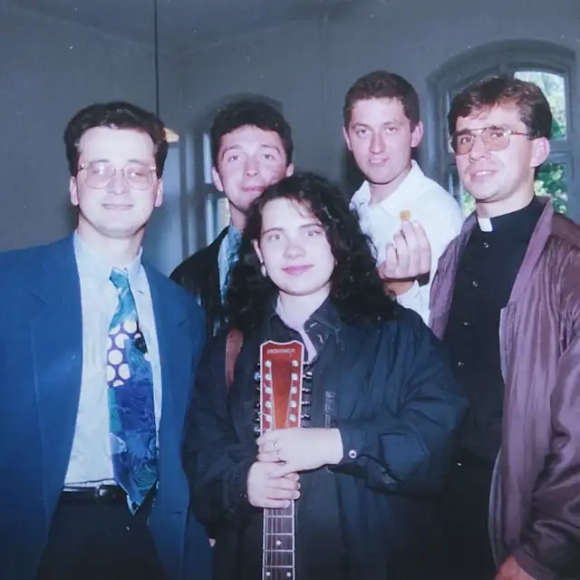 Tomica Kolar surađivao je s profesoricom Miloložom još u studentskim danima kad su zajedno bili u grupi Hosana (objavili su 1998. album Luka Srca), u kojoj je svirao i župnik vlč. mr. sc. Antun Vukmanić kojega ćete sigurno prepoznati na ovoj fotografiji (za profesoricu nismo baš sigurni).