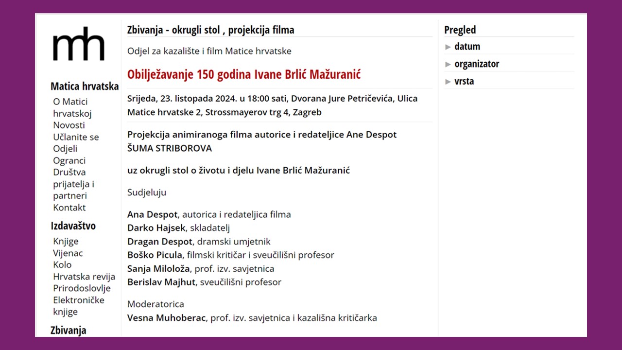 ZAGREB, 23. listopada 2024. U Matici hrvatskoj obilježeno je 150 godina od rođenja Ivane Brlić-Mažuranić filmom Šuma Striborova autorice i redateljice Ane Despot uz okrugli stol o životu i djelu Ivane Brlić-Mažuranić.